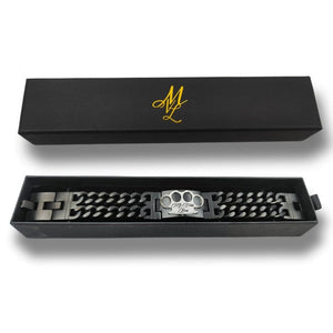 • Bracciale pesante in acciaio inossidabile con logo MVL in argento.
